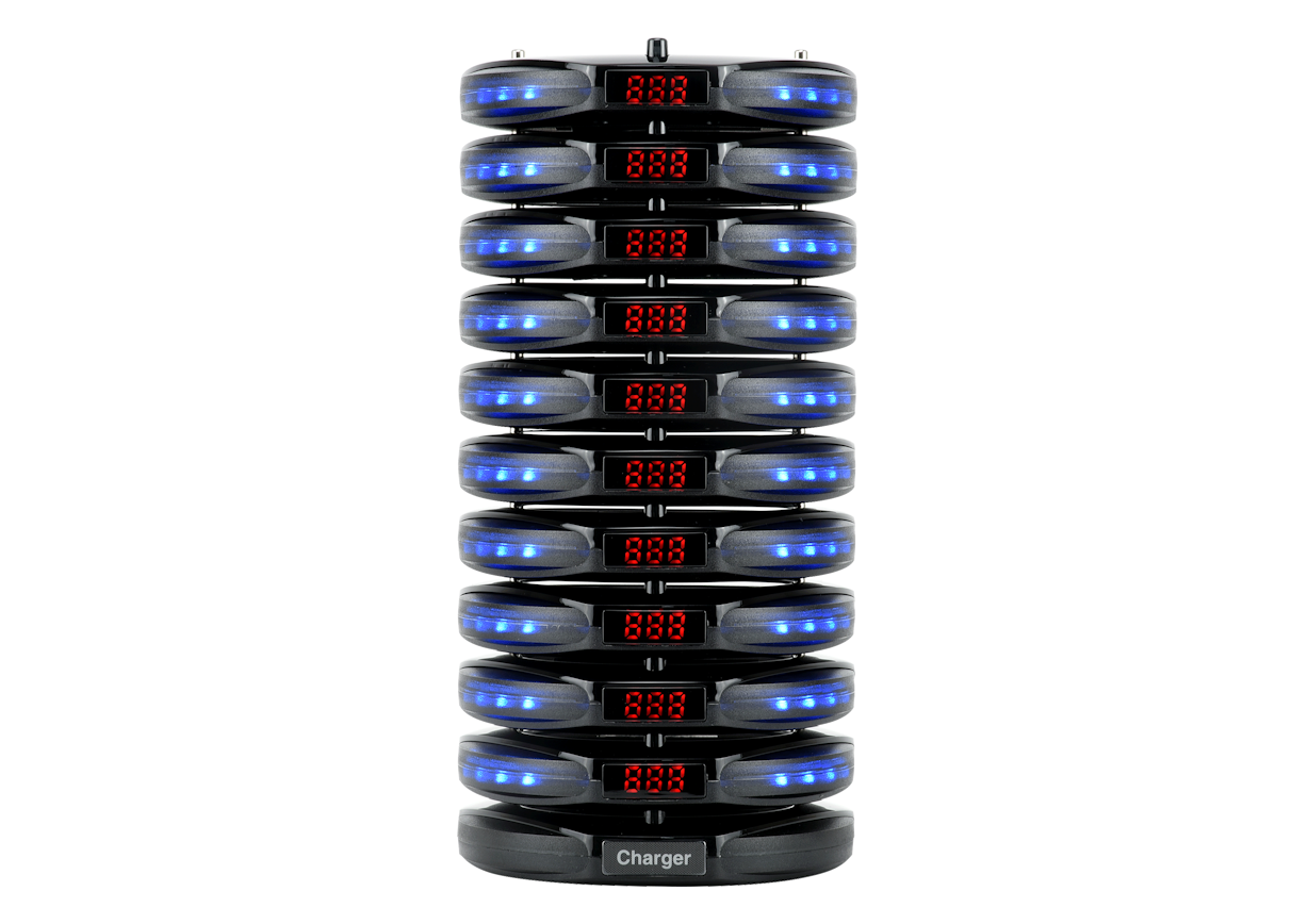 The GPK-02P paging system includes the ATX-02 transmitter, GP-02Pro pagers, and a GPC-02 stackable charging base. Its standout feature is the stackable charging design, which allows all pagers to be neatly arranged in just 10 cm of counter space—making it ideal for small or space-constrained environments such as kiosks, food stalls, or compact restaurants.