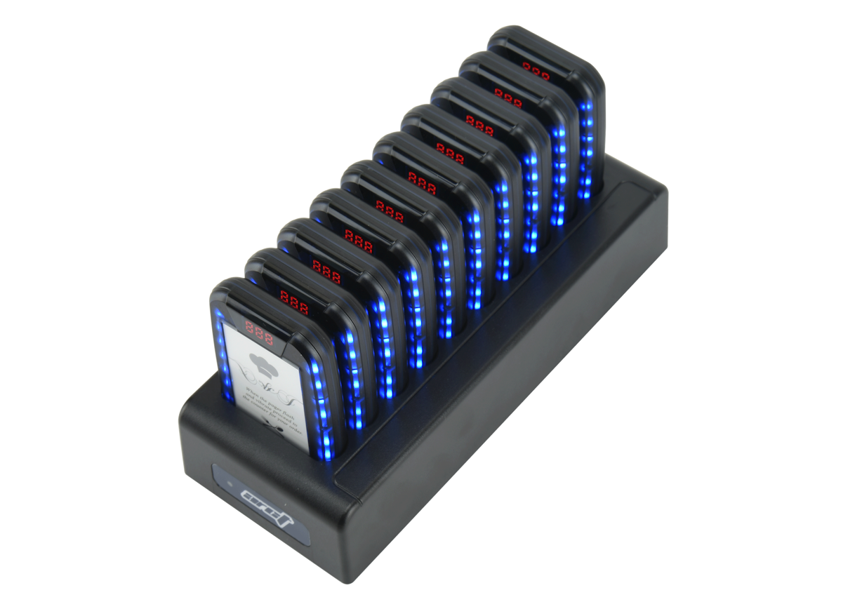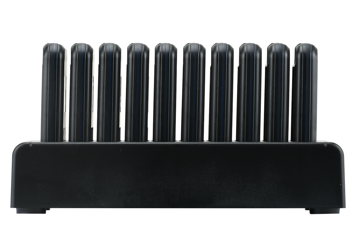 10-Slot Charging Dock: Clear visibility of available and in-use pagers for efficient management.